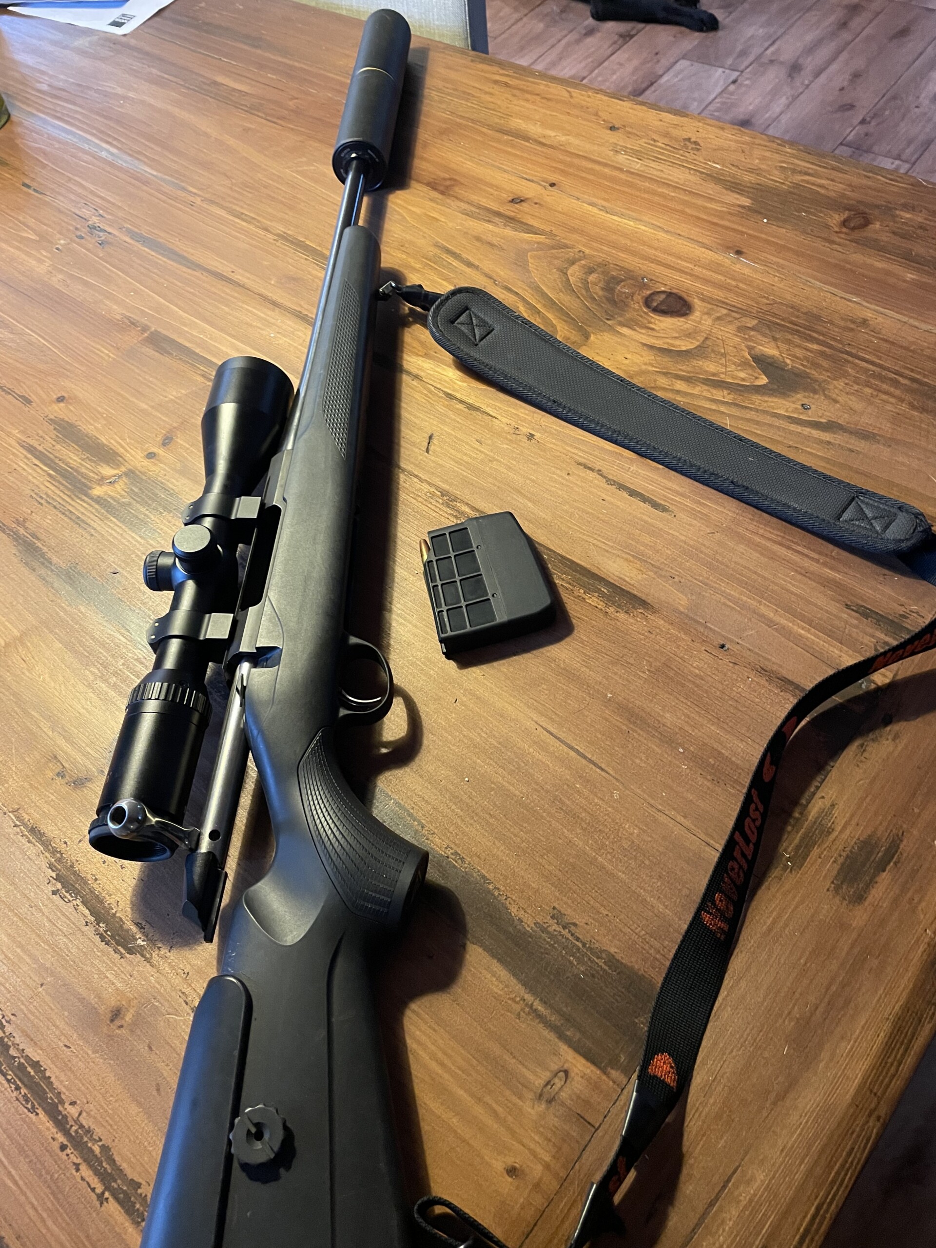 Paket med ljuddämpare Stalon W110 samt sikte Scandium 2,5–10x50IR. Magasin för fem skott. Inköpt 2016. Sparsamt använd.