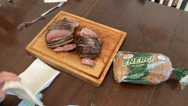 Först vid halv två dök kursledaren, tillika Välmående & Äventyrs ägare, upp med fem kilo nötkött, som efter tillagning åts direkt från skärbrädan eller servetter utan tillbehör.