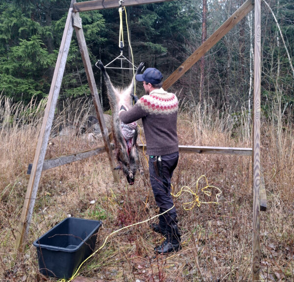 Vid lunch visade JRF:s skyttekoordinator Oskar Fredrik Jonsson, som under jakten även agerade hundförare, hur man tar ur vildsvin på de två som hade skjutits av de nya jägarna.