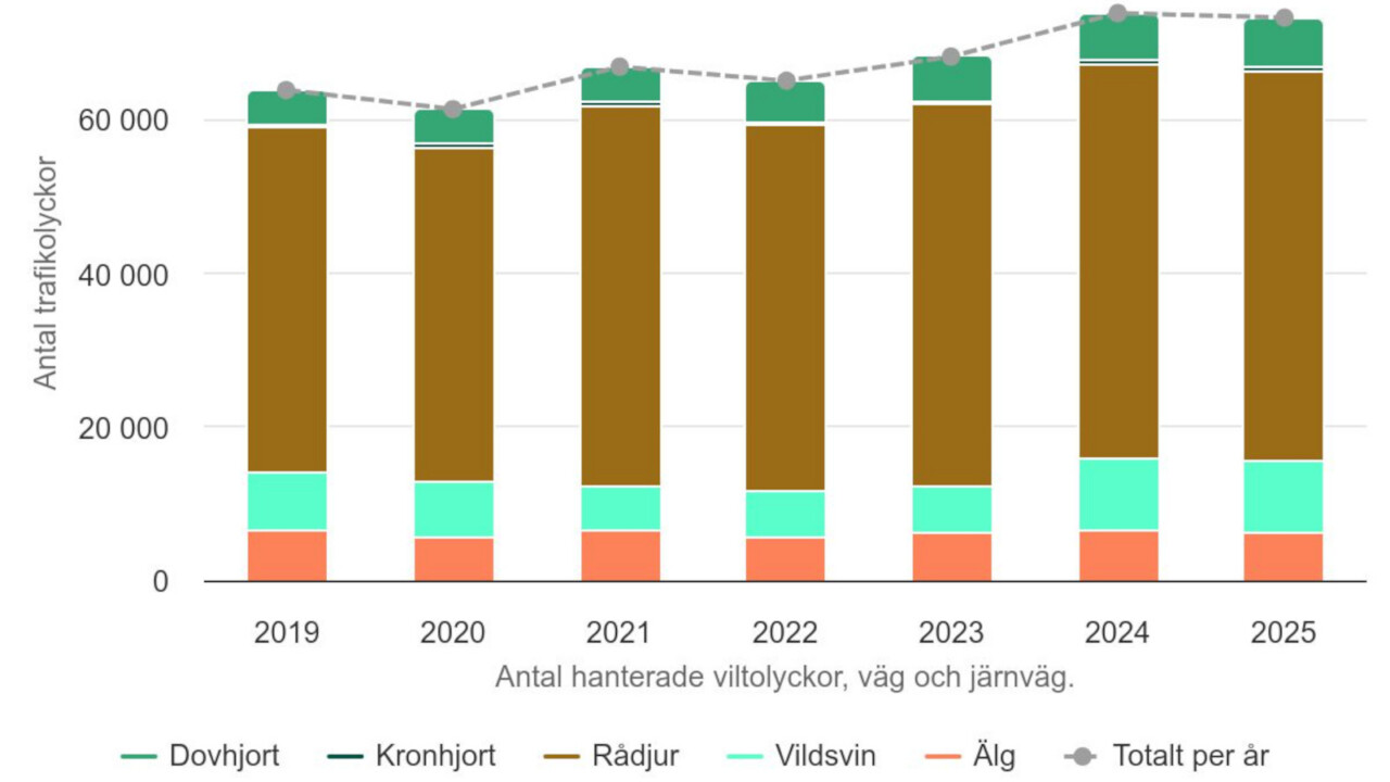 Trafikolyckor med vildsvin har legat på en hög nivå under flera år, och under 2025 nådde olyckorna med dovhjort den högsta nivå som hittills uppmätts. För andra arter som rådjur, älg och kronhjort syns inga tydliga förändringar jämfört med tidigare år. Det skriver Trafikverket i ett pressmeddelande.