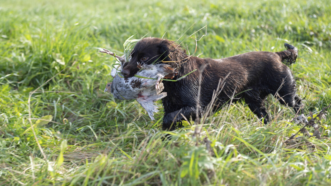 Hundarna förs i huvudsak i motvind och de flesta söker i ett fint sicksackmönster framför förarna där terrängen är öppnare och lättare. I kantzonen mot en klövervall får Helenas hund Birdie ännu en perfekt fågeltagning. En mindre grupp rapphöns stöts upp ur dikeskanten.