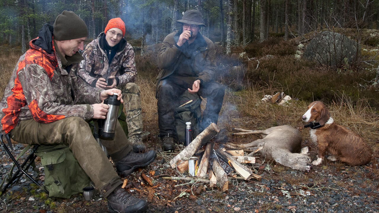 Så strålar vi samman och gör upp eld, grillar korv, dricker kaffe, äter smörgås, resonerar om jakt och hundar och bössor och ammunition, och innan sista slurken kaffe har det börjar skymma över skogen. Någon mer såte blir det inte. Dagen har förflutit i lagom långsam takt. Som rådjursjakt med drivande hund ska vara.