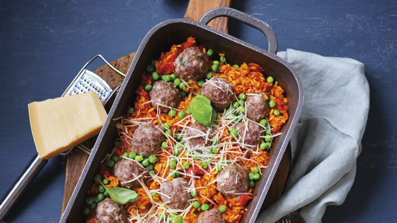 7. Ta ut formen och fördela färsbollarna ovan riset och ställ in i ugnen ytterligare 10–15 min beroende på hur stora köttbollarna är.