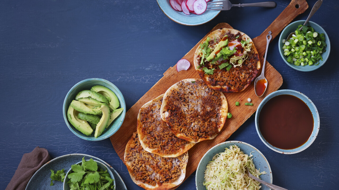 En asiatisk variant av tacos, där färsen steks direkt på tortillabrödet och serveras med olika tillbehör på klassiskt vis.