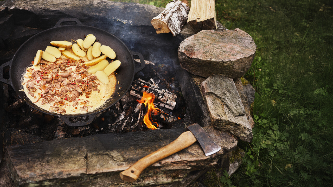 Förbered rätten hemma genom att hacka löken, och om du vill kan grädden blandas med senap, salt och peppar så är smaksättningen klar på en gång och det är bara att slå alltsammans i pannan.
