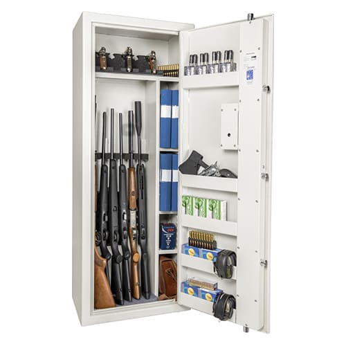 Vapenskåp måste vara robust konstruerade med minst fyra millimeter tjock stålplåt och låsbommar som kan manövreras i minst tre riktningar. De bör även vara utrustade med borrskydd för låset och skydd mot försök till sprängning. Både nyckellås och kodlås är acceptabla val av låssystem.