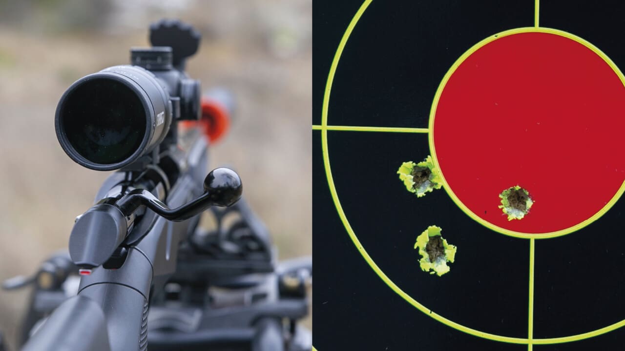 Höger: Första träffbilden som Max Zetterman sköt med testvapnet mätte drygt tre centimeter. Med en helt ny studsare och fabriksladdad ammunition är det fullt godkänd precision.