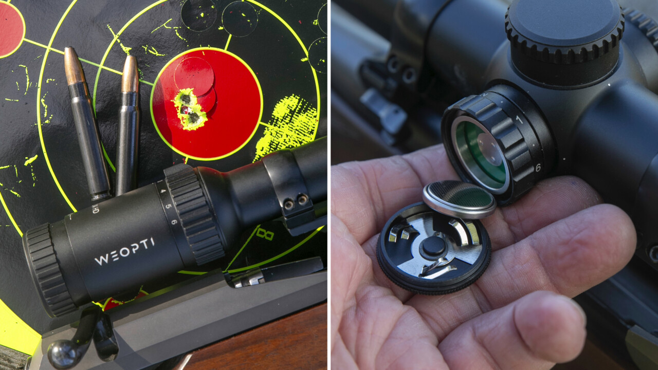 Höger: Styrkan i det belysta riktmedlet är justerbar i sex lägen. Ljuset drivs med ett 2032-batteri.