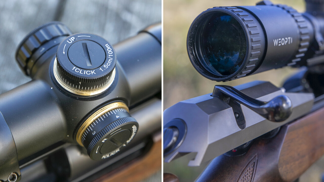 Vänster: Träffläget ändras med 1,5 cm per klick på 100 meter, i både höjd och sida.